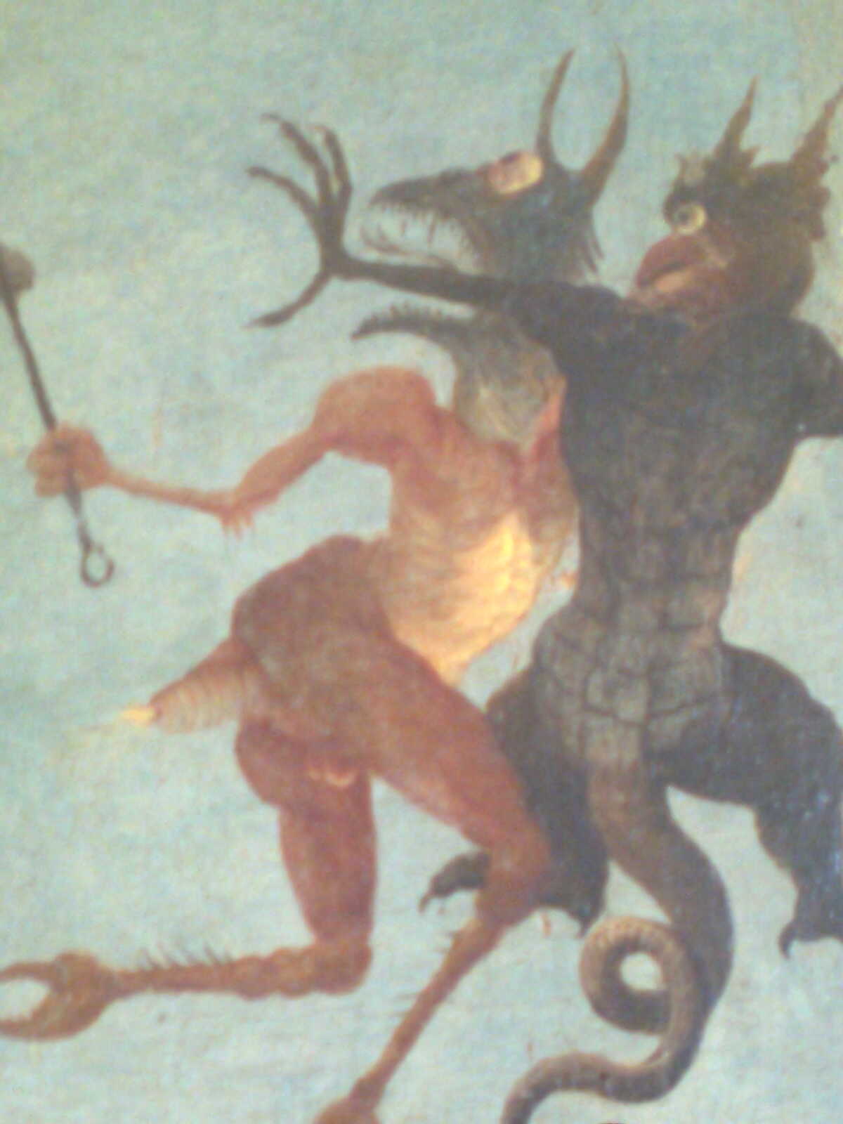 Dülledt szemű démon és küklopsz barátja. Mihály arkangyal épp kihajítja szegényeket a mennyből . Josse Lieferinxe Kálváriájának részlete (1500 körül, Provance).
